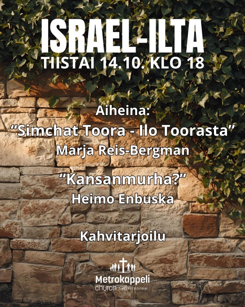 18.00 Polttopisteessä Israel. Israel-ilta B-salissa kahden teeman äärellä: ”Lehtimajajuhlan viimeisen päivän sanoma.” Marja Reis-Bergman. ”Israel ja kansanmurha.” Heimo Enbuska