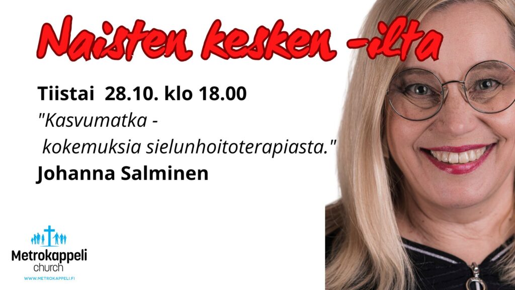 18.00 Naisten kesken -ilta B-salissa. ”Kasvumatka – kokemuksia sielunhoitoterapiasta.” Vieraana ratkaisukeskeinen lyhytterapeutti ja sosionomi Johanna Salminen.