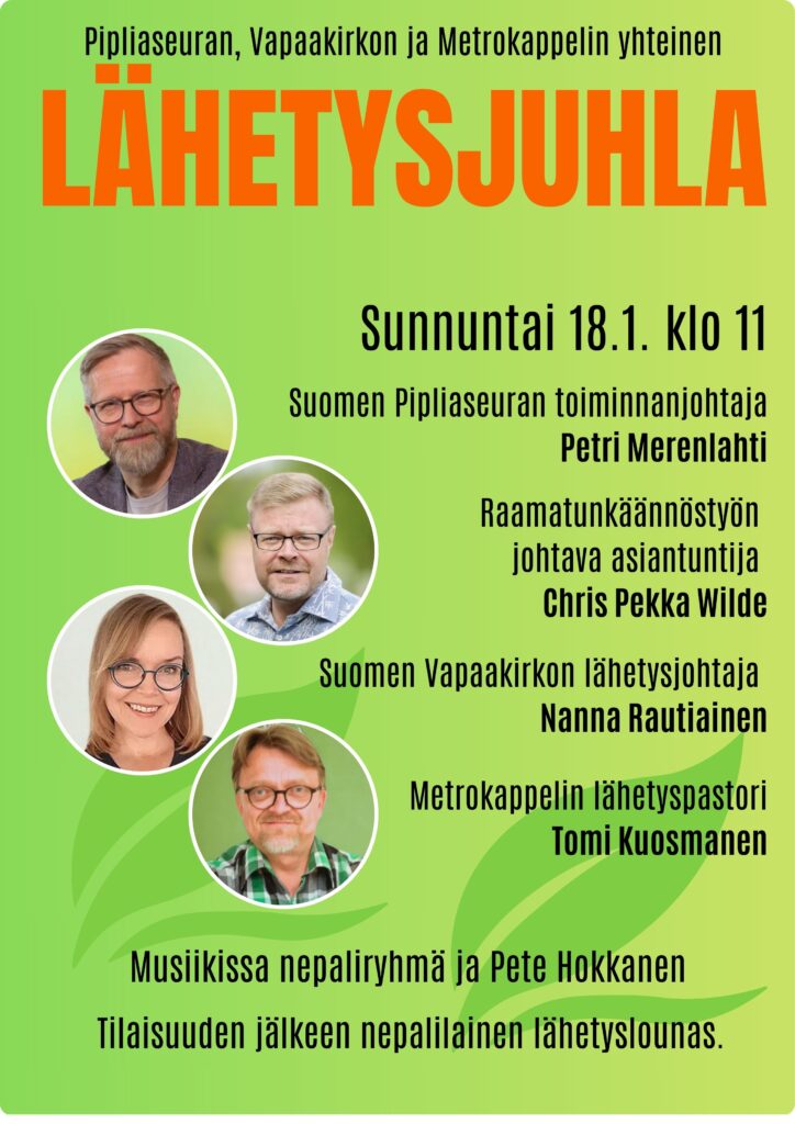 11.00 Suuri lähetysjuhla. Mukana Suomen Pipliaseuran toiminnanjohtaja Petri Merenlahti, Raamatunkäännöstyön johtava asiantuntija Chris Pekka Wilde, Suomen Vapaakirkon lähetysjohtaja Nanna Rautiainen ja Metrokappelin lähetyspastori Tomi Kuosmanen. Musiikista vastaa nepalilaisten musiikkiryhmä ja Pete Hokkanen.